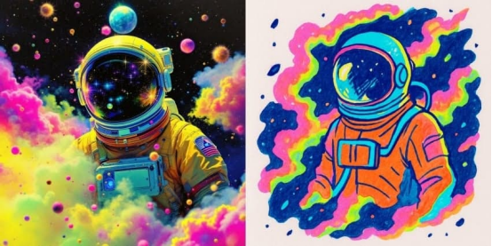 提示詞:星云中的宇航員,電光藍/熒光粉/酸橙綠,賽博朋克美學