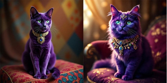 提示詞:紫羅蘭短毛貓+祖母綠眼睛+藍寶石首飾,天鵝絨坐墊,巴洛克風格