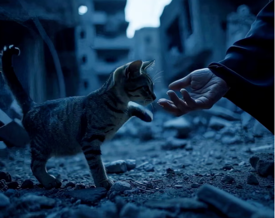 對普通觀眾而言,這可能是幾周前某場地緣政治危機的電影化再現,仿佛匆忙拍攝于中東某地。但事實上,這段畫面從未實地拍攝,不存在真實場景,那位喂貓的女性也并非演員——她根本不存在。