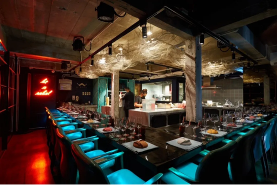 餐廳內部采用鄉村風格設計,藍色座椅與混凝土柱和高天花板相得益彰,霓虹燈裝飾增添了一份活力和趣味。您可以在僅有 14 個座位的廚師臺上,近距離感受這場視覺與味覺的盛宴。