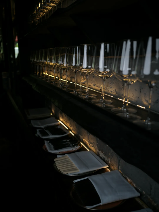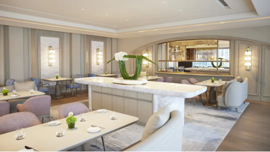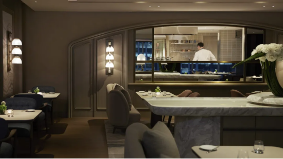 餐廳內,長條形波浪吧臺和開放式廚房提供了親密的用餐體驗,顧客可以近距離觀看每道菜的制作過程。
