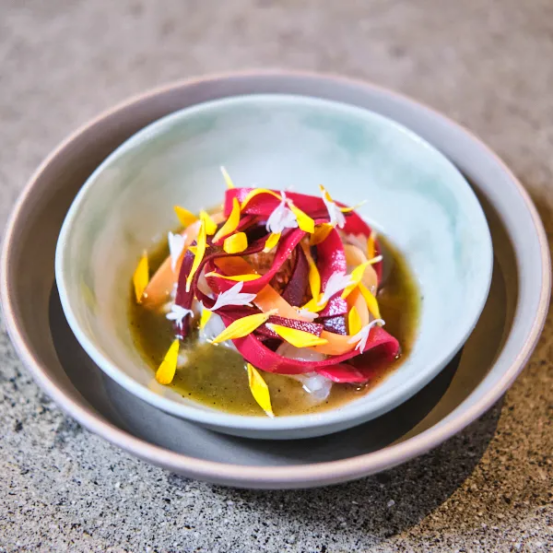 卡爾弗特主廚的菜單深受他在亞洲各地的烹飪經驗影響,12 道菜如佐賀縣藏紅花馬賽魚湯和帶骨河豚等,突顯了他將傳統法式技法與亞洲食材完美結合的獨特風格。