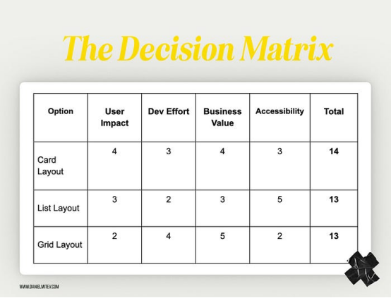 當面臨多個優質選項時,決策矩陣能化主觀為客觀: