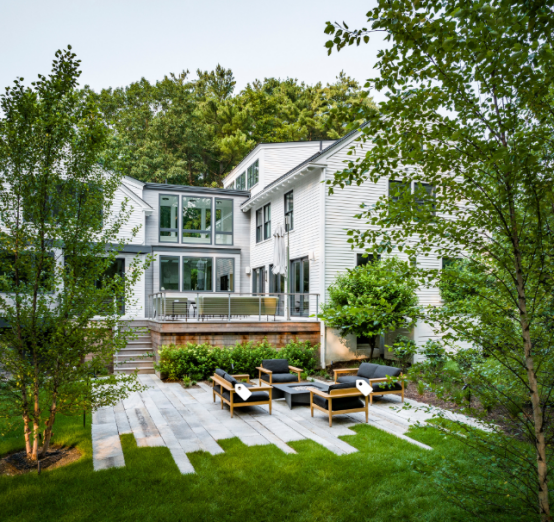 美國馬薩諸塞州牛頓市的這處露臺,采用再生花崗巖板錯落拼接的設計,將尋常鋪地轉化為意外驚喜。景觀設計師Michael D'Angelo形容其為"逐漸消融于景觀中的露臺"。參差排列的石材為傳統設計注入新鮮動感。