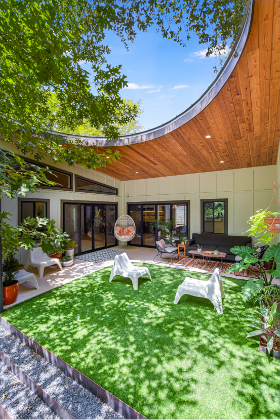 這處位于德克薩斯州北奧斯汀的露臺,曲線形頂棚在提供充足遮蔭的同時保持通透感。Studio QL設計的染色榫接木作與室內天花板呼應,完美契合其中世紀現代風格住宅。