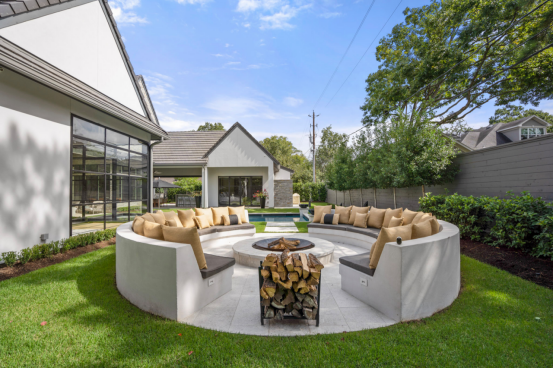 休斯頓Tanglewood社區的這處副露臺上,圓形火塘成為視覺焦點。Design DCA團隊將此處遠離主屋與泳池的角落轉化為聚會勝地,弧形長椅引導人們圍坐篝火暢談。