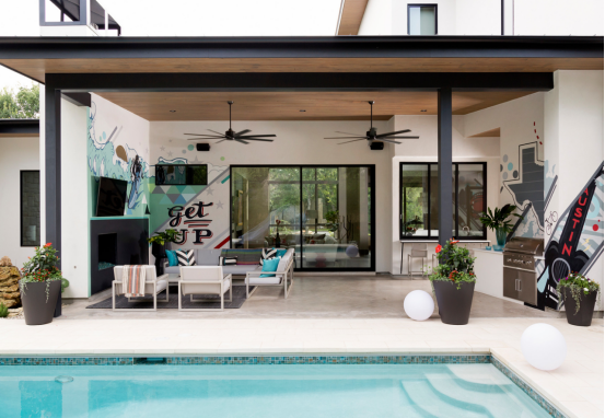德克薩斯州Rollingwood的這處露臺墻壁布滿沖浪主題壁畫,為泳池與住宅之間的休閑區營造明快背景。Align Austin Architects團隊還配置了夏日風扇、冬日壁爐、觀賽電視及廚房傳菜窗。