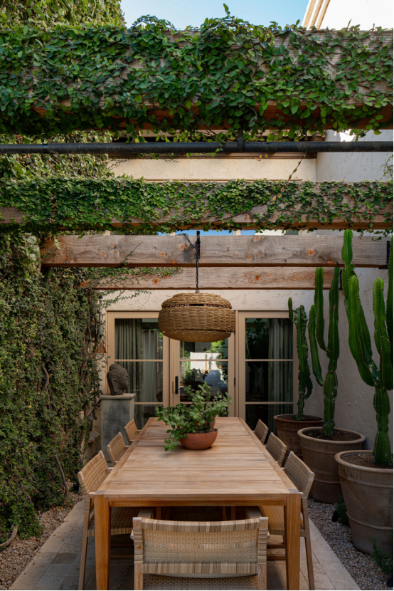 鳳凰城這處用餐露臺巧妙抵御亞利桑那烈日,厚重涼亭橫梁遮擋直射陽光,攀緣植物增添自然氣息,頂部噴霧系統更帶來清涼。原本建筑夾角處的閑置空間就此變身聚會勝地。