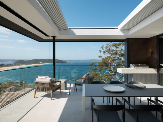 悉尼棕櫚海灘這處高層露臺采用可調節百葉頂棚,既可作為觀星天窗,又能在雨天或強光下閉合而不影響海景視野。Watershed Architects的改造從戶外空間延伸至室內。