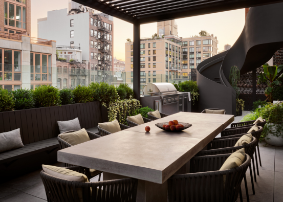 紐約復式公寓的螺旋樓梯連通上下層露臺,流暢曲線與圍合側板致敬經典滑梯造型,將懷舊情懷融入工業現代風格。BuiltIN studio的設計與住宅風格相得益彰。