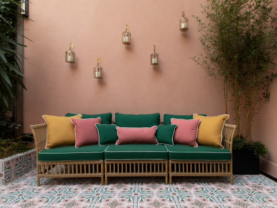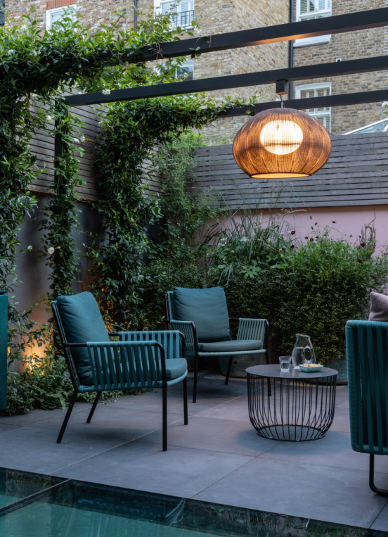 Rebecca James Studio將倫敦西區聯排別墅的戶外區域改造為家庭樂園。設計師從建筑裝飾藝術風格中汲取靈感,通過淡彩墻面、醒目地磚、翡翠綠藤編沙發與懸掛燈籠,營造出溫馨的戶外客廳氛圍。