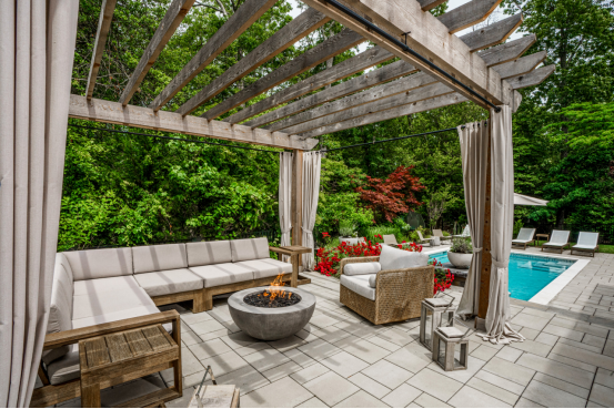 新澤西州Newfield的涼亭露臺,全長窗簾既優雅又實用。Ledden Palimeno Landscape設計的窗簾軌道可防曬遮陽,束帶能固定幔帳,俯瞰泳池的位置完美兼顧休閑與監護功能。
