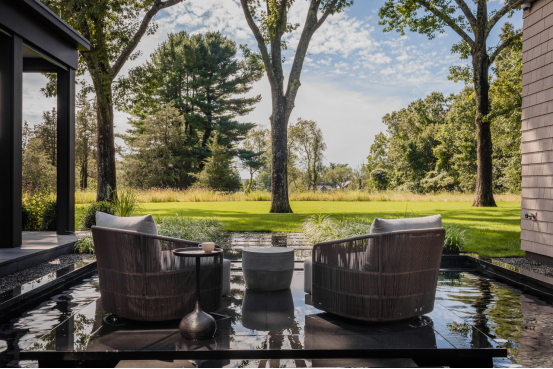 波士頓這處夾于兩面墻之間的小露臺仿佛浮于水面。Brookes + Hill Custom Builders將其融入鏡面水池,打造出觀景涼亭,石板小徑確保出入不濕腳。