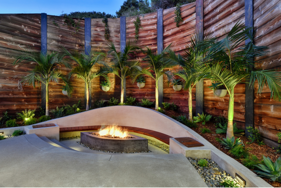 設計師Einat H. Artzi用曲線長椅與匹配火塘柔化狹長露臺,波浪造型暗合圣地亞哥海濱氣質。棕櫚樹打破高墻單調,搭配地栽植物、垂吊花盆與墻面綠植,輔以微妙燈光畫龍點睛。