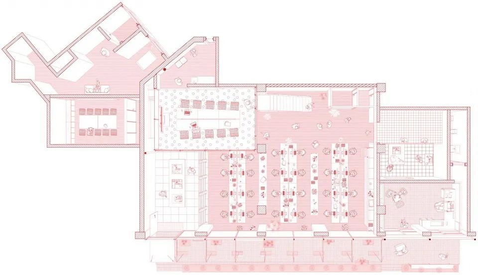 辦公室內一層的整體區域用作辦公活動使用,憑借層高的優勢向內置入了三個維度的盒子:大會議室,樓梯,以及模型室。模型室背面的窗戶即連接著咖啡廳,使模型室同樣也作為對外的觀察窗口展示,體現出了充分的價值:不需要額外的投入,就能吸引到大量的顧客,畢竟來喝咖啡就相當于來看了免費的建筑展覽。而這也模糊了咖啡館與建筑師工作室的界限。