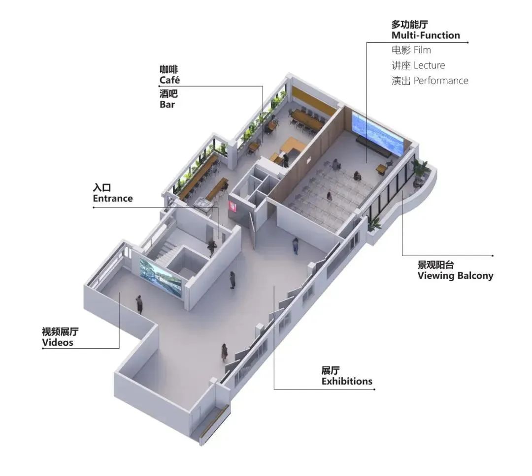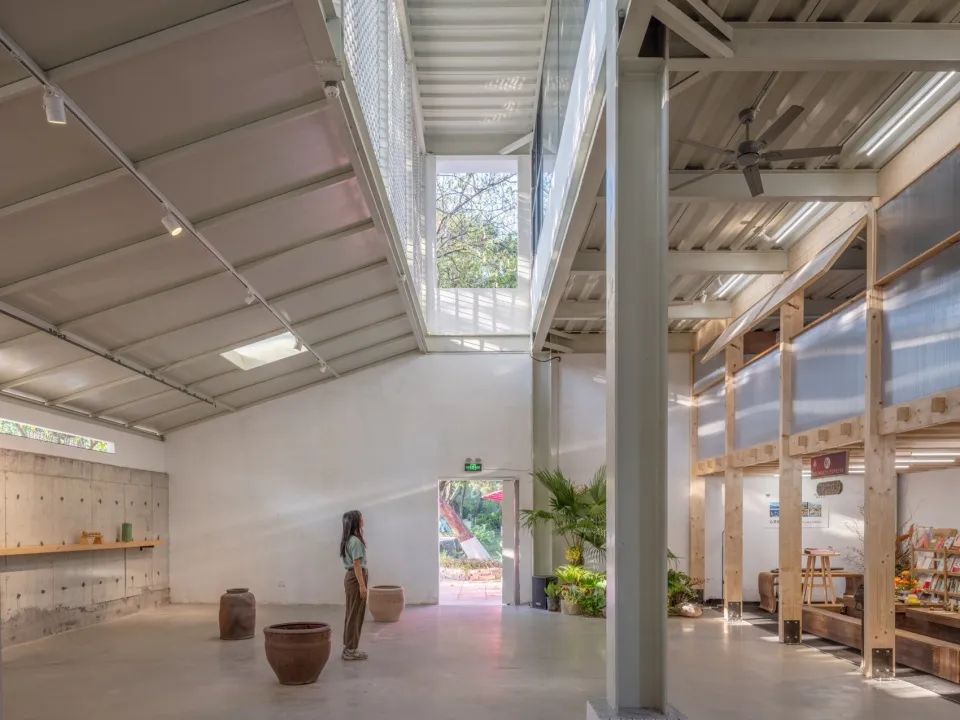 該建筑主體為三層結構,其中二層專供事務所內部辦公使用,其余樓層均為美術館空間。最初,美術館被構思成一個被大樹所覆蓋的露天展覽空間。但考慮到周圍環繞的綠地以及不遠處的保留農田都能成為無界博物館展廳延伸的一部分,最終決定覆蓋以最輕薄的復合屋面板,僅開設一個天窗將樹木的輪廓裝裱成畫,將窗外綠意引入展廳。
