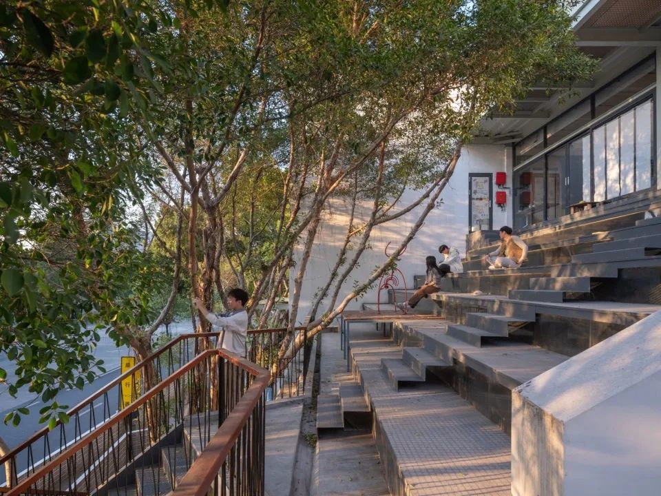 基于對場地西側生態濕地的保護考量,設計特別保留了現狀大樹,為此將建筑二、三層的西側體量縮減一半,并創新性地將屋面設計成與樹冠形態相呼應的階梯式"樹下劇場",通過將建筑表皮轉化為公共活動區域,使動態的人流構成生動的建筑立面。