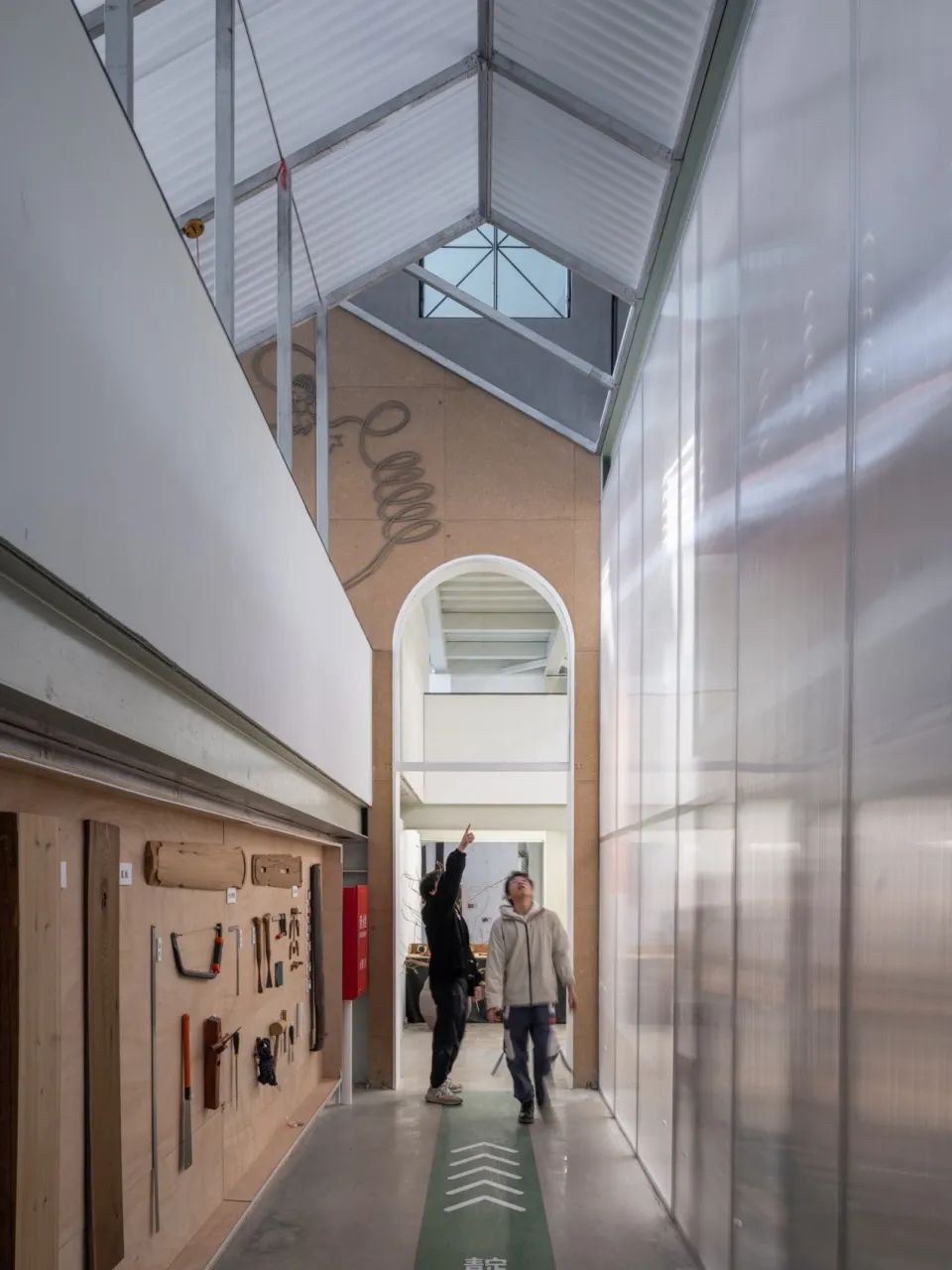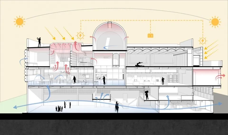 建筑內部設計了一條貫通兩層的美術館室內街道,這一空間策略既延續了傳統村落“冷巷”的通風降溫智慧,又結合了配備智能控制系統光伏天窗的內天井設計。傳統營造智慧與現代科技的結合,不僅顯著提升了建筑的通風降溫與節能效果,還通過太陽能發電有效降低了運營碳排放,使藝術展示空間更具日常公共屬性。