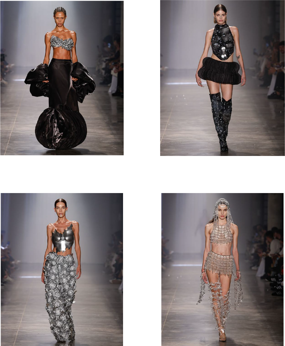 Artemisi 2025春季系列以“Into the High”為主題,延續品牌一貫的先鋒科幻與實驗性風格,通過液態金屬、樹脂等創新材質的運用,打造出充滿未來感的流動美感。服裝隨穿著者動作自然起伏,打破傳統材質的靜態局限;夸張輪廓、不對稱剪裁與獨特拼接,進一步強化視覺沖擊力,挑戰常規比例。色彩上以冷冽金屬色(銀、金)與透明樹脂色為主,交織出虛實相生的星際氛圍,將科幻感直接穿在了身上。