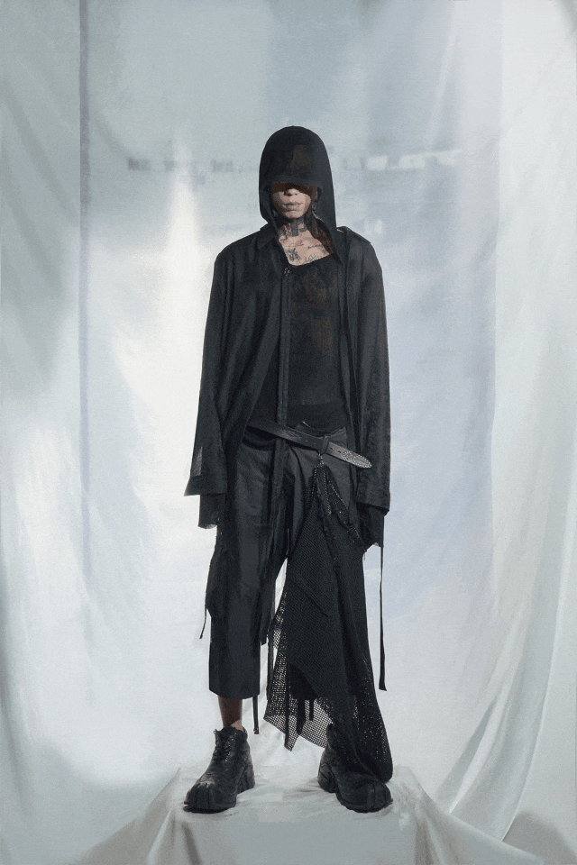 Aesynctx 2024春夏系列以“"EMERGENCY”為題,單色調工業色(冷灰、水泥黑)主導,激光切割PVC層疊覆蓋做舊針織,配以變形蟲紋路的生物光澤配飾。峻工業感暗喻科技異化,而菌絲狀配飾象征自然生命的反噬,呼應Y3K的“末日生態”焦慮。