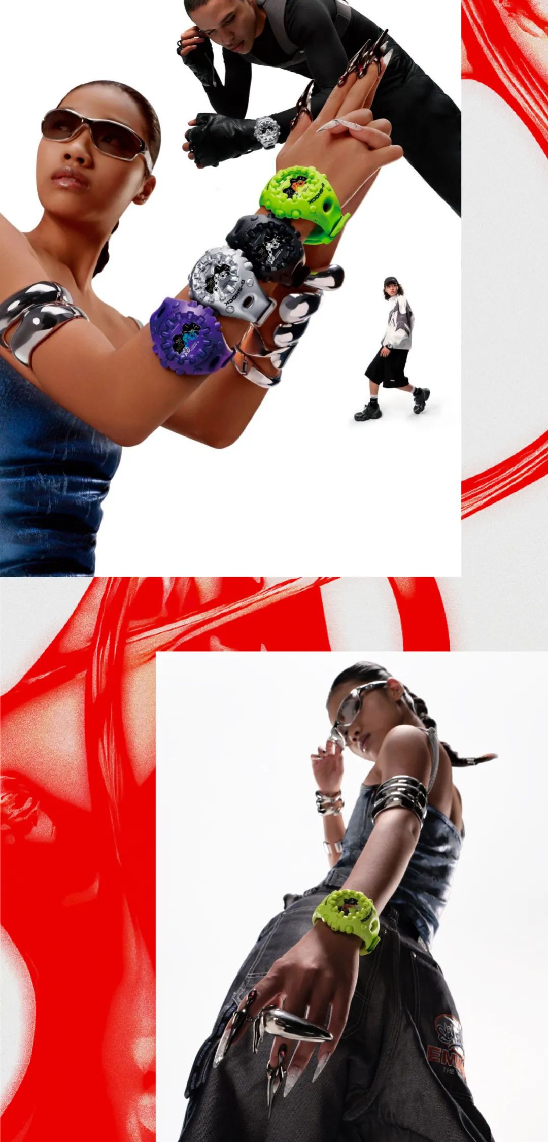 G-SHOCK GA-V01系列腕表,以磁力分針技術替代傳統機械結構,搭配金屬銀、熒光黃與電藍紫等高飽和霓虹色,表殼采用一體成型鏤空金屬層疊設計,模擬機械裝甲的立體感。其設計體現對“Year 3000”的具象化想象——將腕表視為未來戰士的裝備,通過硬核科技與視覺張力傳遞Y3K美學。