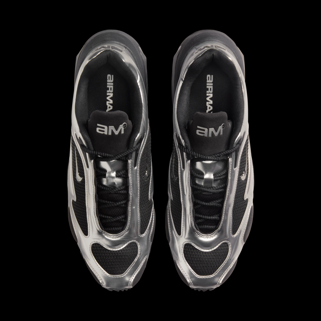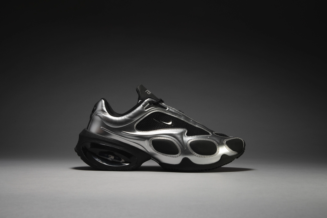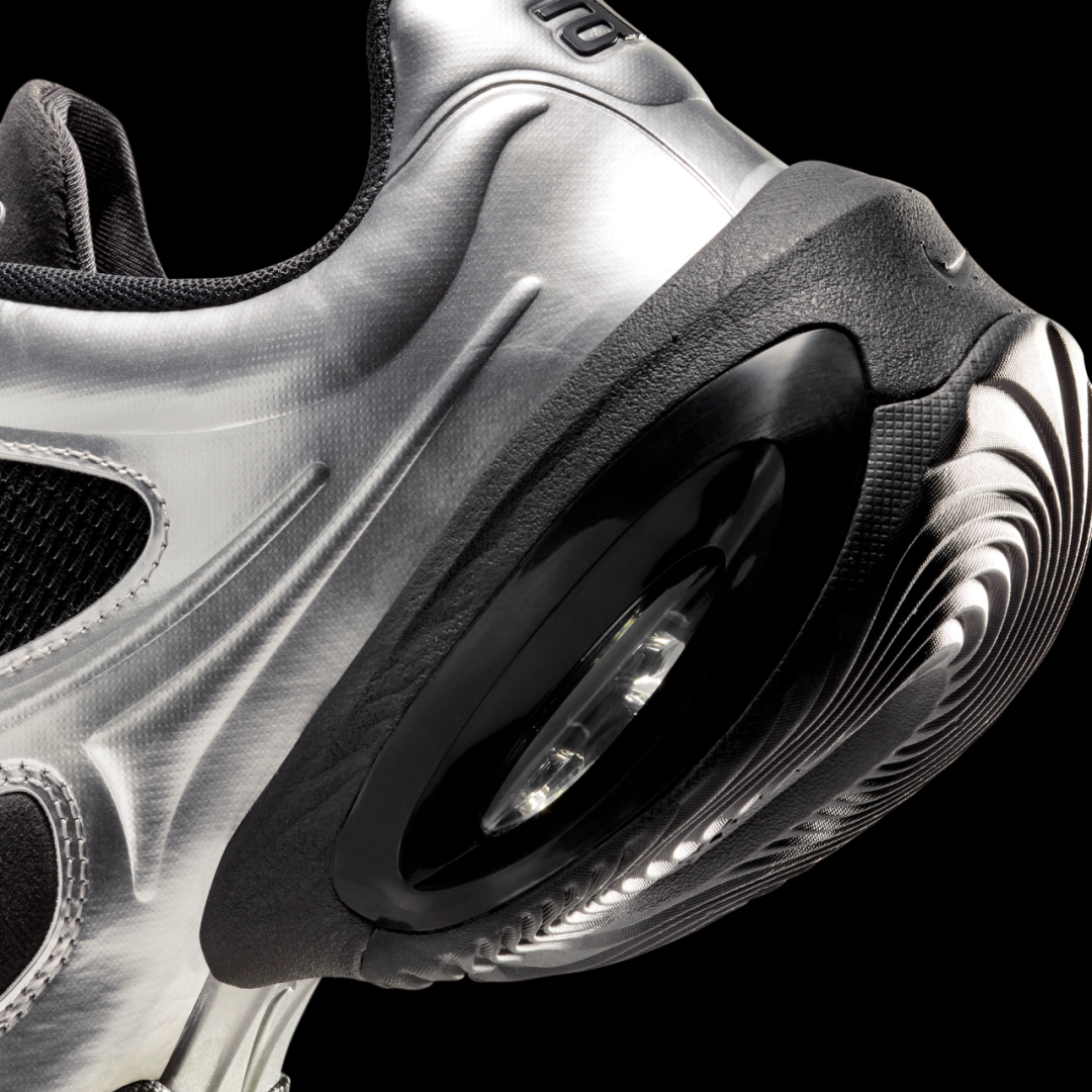 Nike Air Max Muse運動鞋,其銀色金屬配色呼應 Y3K 的液態金屬質感,半透明網布與 TPU 支架構建科技材質層疊,契合虛擬數字基因。外形設計上,流線型輪廓與夸張足弓強化賽博線條,后跟Air氣墊半亮面處理成未來符號。并且外層的冰川藍涂層,在陽光的折射下會有霓虹光感。