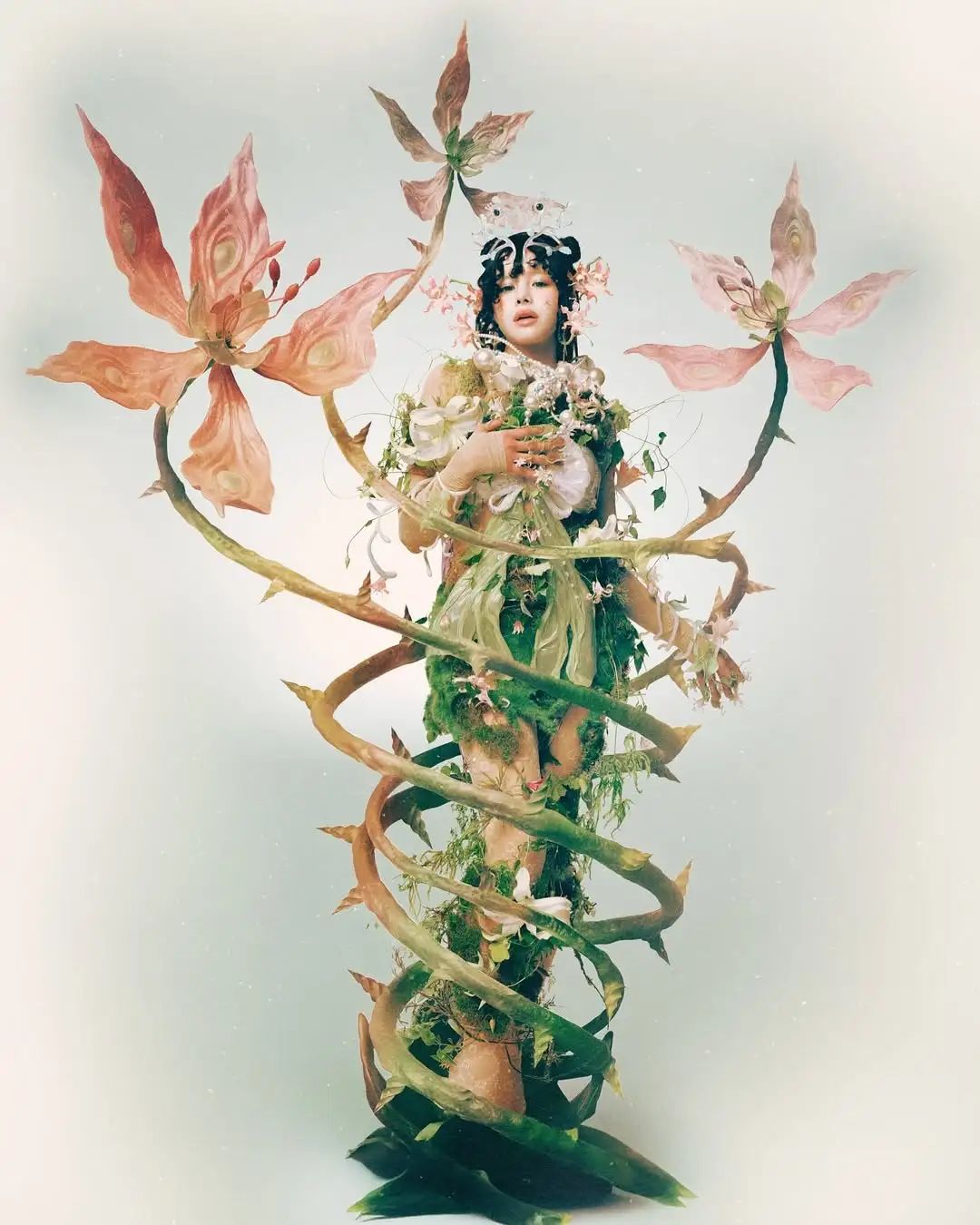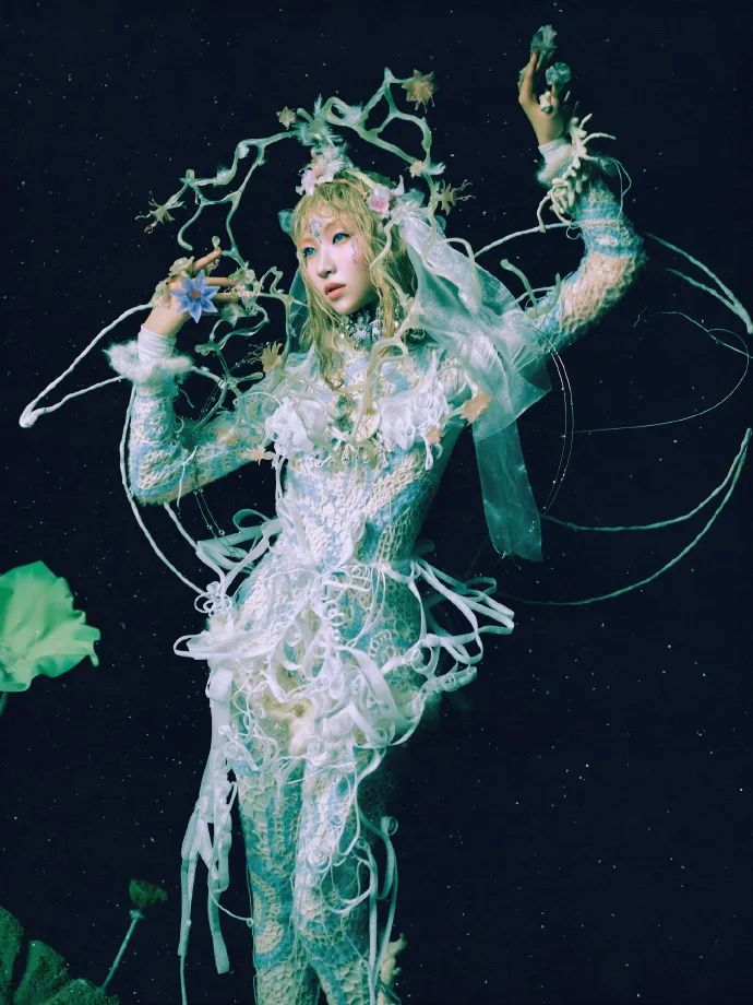 XG mini2專輯預告照中的植物機械美學,完美詮釋了Y3K風格的核心矛盾——冰冷科技與有機生命的共生。在Y3K對“Year 3000”的未來想象中,流動變異感是關鍵元素:藤蔓般的金屬結構纏繞肢體,葉片與電路紋理交融,如同菌絲在機械體上自然蔓延。這種設計將自然生長形態轉化為“人機共生”的視覺語言,呼應Y3K特有的非人化輪廓與廢土感生命力,突破傳統女團框架,完美詮釋Y3K的金屬質感與超現實感。
