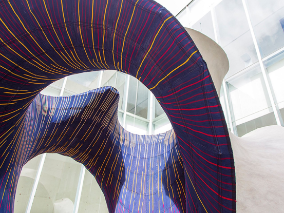 這個展亭重5噸,覆蓋50平方米,由四條長帶組成的雙層3D紡織品構建而成。下層形成色彩繽紛的天花板,而上層則包含了用于模板纜線的袖套和用于放置氣球的口袋,這些氣球在混凝土澆筑后形成空洞,既減少了材料使用,也減輕了整體重量。KnitCandela 在蘇黎世聯邦理工學院開發完成,僅用兩個行李箱即可運輸,它展示了針織紡織品如何能夠在完整的建筑尺度上實現輕質、富有表現力且可持續的混凝土結構。