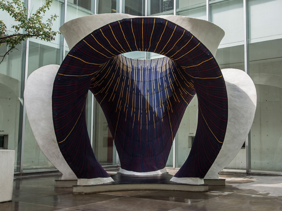 蘇黎世聯邦理工學院(ETH Zurich)與扎哈·哈迪德建筑事務所計算與設計小組(ZHCODE)以及 Architecture Extrapolated (R-Ex) 合作,推出了一種3D針織殼體,作為曲面混凝土形式的關鍵結構組件。在墨西哥城大學當代藝術博物館(MUAC)展出的 KnitCandela 原型,是這種方法首次在建筑尺度上的應用。該項目從建筑師 Félix Candela 創新的混凝土殼體中獲得靈感,利用 KnitCrete 模板技術,無需傳統模具即可生產復雜的自由形態混凝土表面。