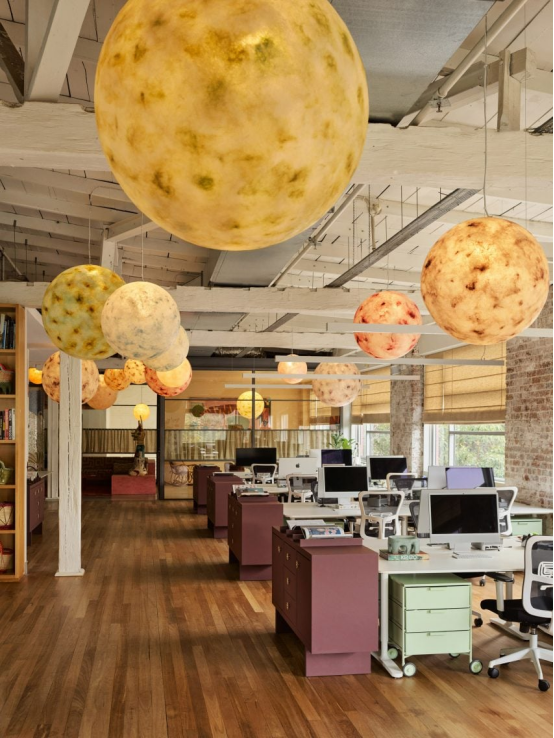 空間中超凡脫俗的細(xì)節(jié)還包括辦公室各處懸掛著的大量帶有斑點(diǎn)的球形燈,它們大小不一,顏色各異。