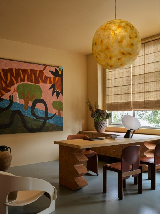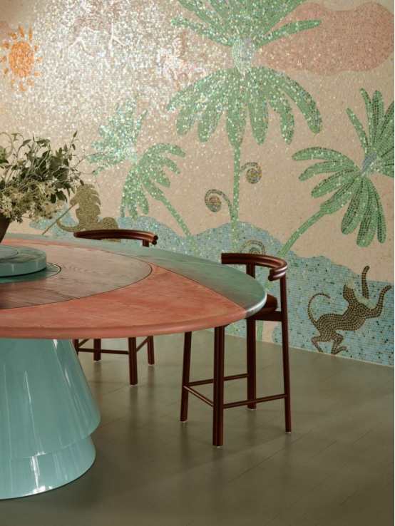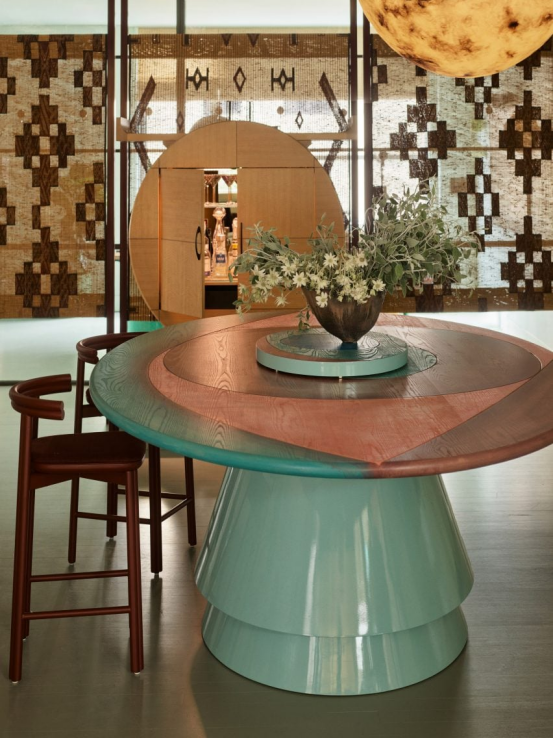 “我最喜歡的是我們定制的‘眼睛’餐桌,”她補(bǔ)充道。“我們用柔和色調(diào)手繪了其凸起的淺色木制橢圓桌面,以突出天然的木紋圖案。”