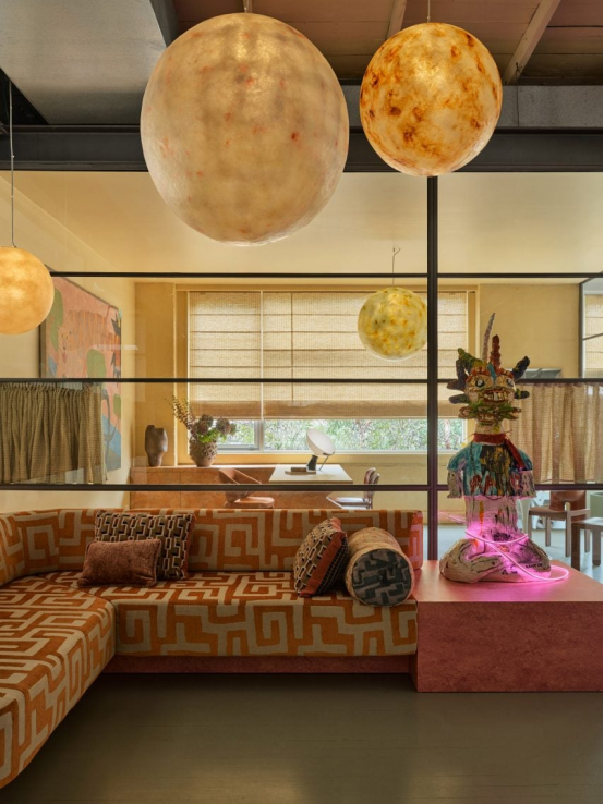 “我們用充滿活力的部落織物裝飾了入口接待處的長椅,讓人聯(lián)想到一種剛果布料,它將橘色的雪尼爾線與粗獷的亞麻布結(jié)合在一起,”Ghoniem 解釋道。