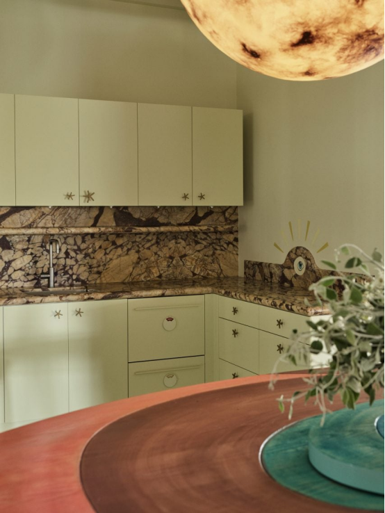 工作室還在整個空間中添加了其他圖形元素,包括廚房櫥柜上的海星形把手、廚房墻上的眼睛圖案、蛇形門把手和裝飾性雕塑。