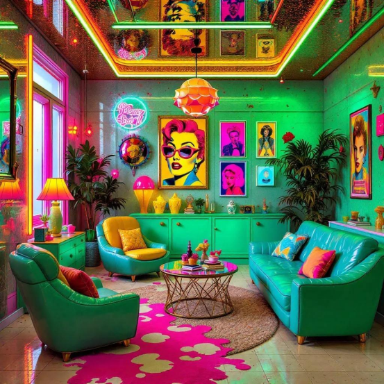 圖片生成提示:一間色彩鮮艷的復(fù)古客廳,配有霓虹燈牌、塑料火烈鳥擺件、絲絨畫作、地毯與柔和色調(diào)的家具,滿是充滿趣味卻略顯俗氣的媚俗風(fēng)格裝飾。