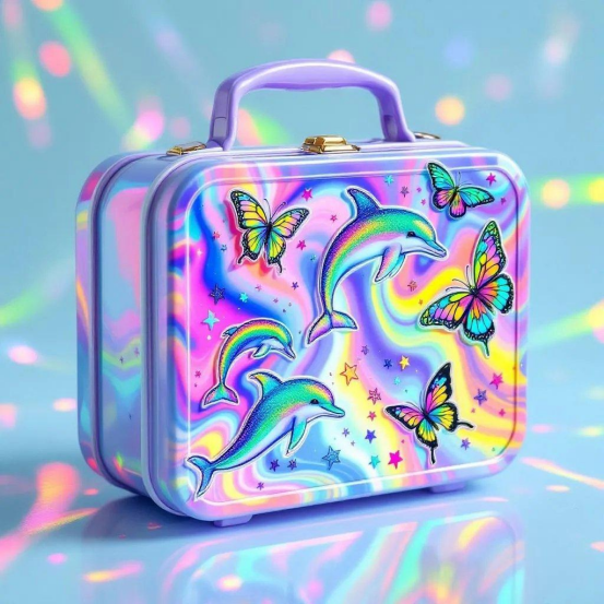 圖片生成提示:一個色彩鮮艷的硬質(zhì)塑料午餐盒,飾有彩虹海豚、霓虹蝴蝶、閃粉貼紙與迷幻漩渦圖案,背景為全息效果。
