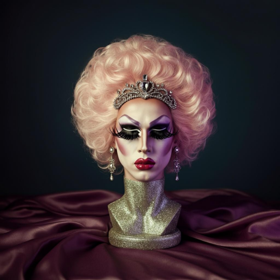 圖片生成提示:一個變裝皇后胸像造型的新奇假發(fā)架,配有彩繪妝容、夸張睫毛、閃耀皇冠與閃粉底座,設(shè)計為反諷風(fēng)格裝飾品。