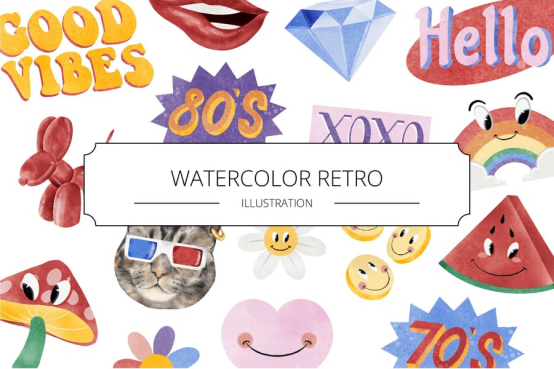 圖片說明:80 年代水彩復(fù)古貼紙插畫
