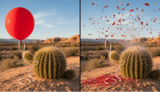 Gemini 2.5 Flash 還能可視化簡(jiǎn)單的因果關(guān)系,谷歌稱之為“真實(shí)世界推理”。在一個(gè)演示中,模型生成了一張氣球飄向仙人掌的圖像,然后又生成了另一張顯示接下來(lái)會(huì)發(fā)生什么的圖像。