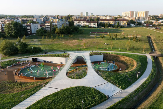 理解到童年公共空間的創(chuàng)造正通過擁抱多樣性和包容性的當(dāng)代方法而演變,自然環(huán)境對(duì)兒童日常生活的影響也展現(xiàn)了其演進(jìn)的能力。若干針對(duì)公園、廣場(chǎng)和其他休閑區(qū)域的設(shè)計(jì)提案旨在不僅灌輸社交技能,還包括與獨(dú)立性、物種保護(hù)、尊重自然、環(huán)境保護(hù)等相關(guān)的生命價(jià)值觀。雖然諸如泰國(guó)春武里府的兒童小屋(Kid Cabin)等項(xiàng)目鞏固了一個(gè)適應(yīng)兒童比例的庇護(hù)所,并擁抱簡(jiǎn)約、與自然的連接和游戲,但也存在更大規(guī)模的干預(yù),例如波蘭蒂黑Jaworek公園的游樂場(chǎng),它將自然景觀與現(xiàn)代休閑解決方案相結(jié)合。在融合休閑、教育和社會(huì)功能的同時(shí),該提案包括一個(gè)水上游樂區(qū)和一個(gè)自然游樂區(qū)。自然游樂場(chǎng)設(shè)有由天然材料制成的游戲和教育元素,沿著蜿蜒的植被小徑布置,并輔以雨水花園,這些花園有助于自然水循環(huán)并促進(jìn)生物多樣性。