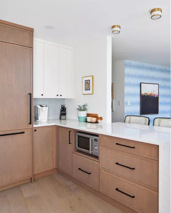 將微波爐或緊湊型冰箱直接嵌入廚房半島,避免臺面雜亂或占用柜內空間。這在小廚房中尤其有用,因為大型電器會顯得過于突兀。抽屜式微波爐或臺下冰箱讓廚房更顯 streamlined 且井然有序。這也優(yōu)化了工作流程,讓客人或孩子拿取飲料或加熱剩飯時無需進入主烹飪區(qū)。這種多功能方法讓半島在小空間和需要物盡其用的情境下,相比島臺更具優(yōu)勢。