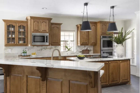 雙層廚房半島是一種聰明的方式,可在緊湊空間內同時滿足備餐與休閑用餐的需求。較低一層作為靠近灶臺或水槽的功能性備餐區(qū),而抬高的上層則可用作用餐吧臺、飲品區(qū),甚至臨時辦公桌。這種高低差設計有助于遮擋廚房雜亂的操作面,尤其適合小戶型或開放式廚房。如果你空間有限,無法擺放傳統(tǒng)餐桌,這種設置提供了一個節(jié)省空間的替代方案,同時仍保持社交性與靈活性。非常適合日常需要在廚房多任務處理的家庭。