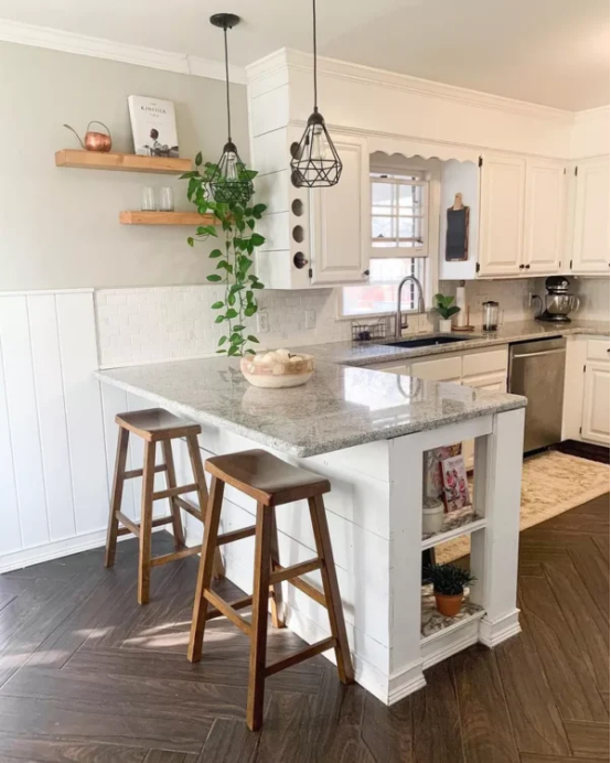 在狹窄或狹長型廚房布局中,采用開放式層架的半島是保持儲物功能且不顯壓抑的聰明解決方案。在外側使用開放式層板替代笨重的柜體,用來存放餐盤、烹飪書籍或小型收納籃。這樣既讓常用物品觸手可及,也保證了光線與空氣的流通,使廚房顯得更寬敞。開放式設計還能在有限空間內緩解視覺壓迫感,避免封閉柜體帶來的臃腫感。這是一種兼顧功能與個性的省空間做法,非常適合需要“一物多用”的小廚房半島。