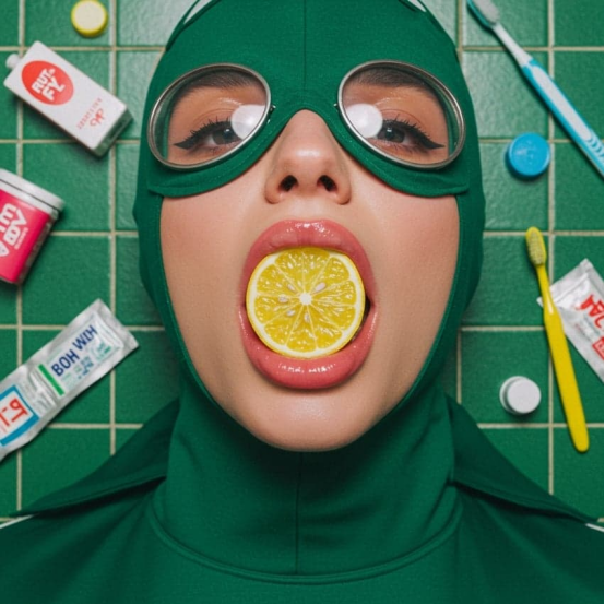 一個人平躺在 #098C60(深綠色)的瓷磚表面上。他們的嘴唇光澤而夸張,微微張開,牙齒間銜著一片假檸檬片。相機直接安裝在正上方,捕捉干凈的俯視圖。照明是刺眼的正面閃光,在頭部和嘴巴周圍形成清晰的陰影。周圍擺放著荒謬的物體,如牙刷、包裝袋或瓶蓋,像一種怪異的儀式布局一樣有意排列。場景中的所有顏色都遵循 RüT 調色板,瓷磚或背景中沒有使用白色或黑色。