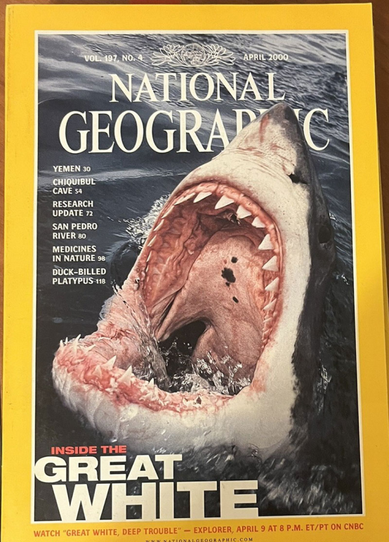 《國家地理》的鯊魚攝影捕捉到了這種頂級掠食者捕獵時的激烈瞬間,多期封面以海洋環保為主題展示大白鯊形象。