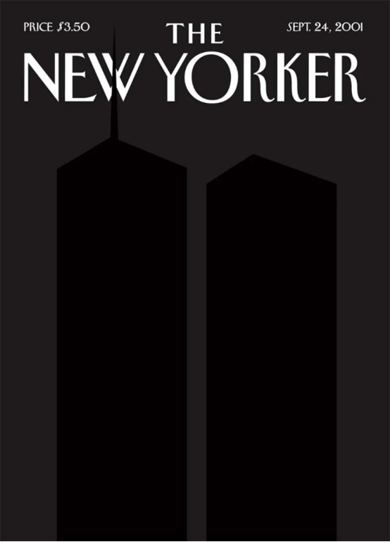 2001年9月24日的《紐約客》封面,在9·11襲擊事件后立即出版,以黑色背景映襯世貿中心雙子塔的剪影。由阿特·斯皮格曼 (Art Spiegelman)?與弗朗索瓦·穆利 (Fran?oise Mouly) 合作,采用極簡的黑上黑技法創作。這期封面代表了9·11事件發生后不久,對國家悲劇最有力的視覺回應之一。