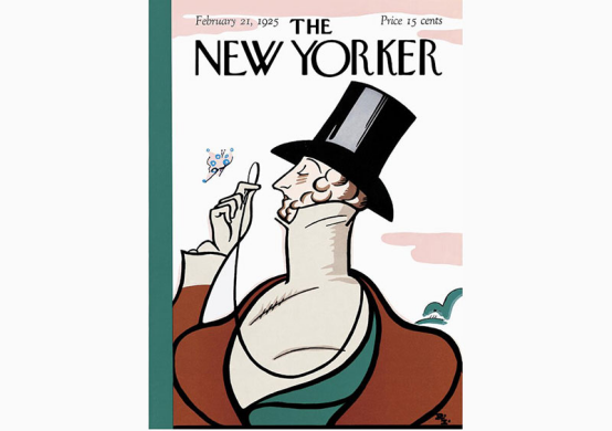 1925年2月21日的《紐約客》創刊號封面,描繪了尤斯塔斯·蒂利 (Eustace Tilley) 通過單片眼鏡觀察一只蝴蝶。由該雜志首位藝術編輯雷亞·歐文 (Rea Irvin)?用鋼筆和墨水插畫創作。此封面確立了雜志高雅的視覺形象,并引入了其最持久的吉祥物。