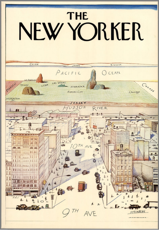 1976年3月29日的《紐約客》封面,展示了索爾·斯坦伯格著名的透視地圖,將曼哈頓視為宇宙中心。由索爾·斯坦伯格 (Saul Steinberg)?運用墨水、鉛筆、彩色鉛筆和水彩技法創作。此封面成為該雜志繼尤斯塔斯·蒂利之后被模仿最多、最具辨識度的圖像。