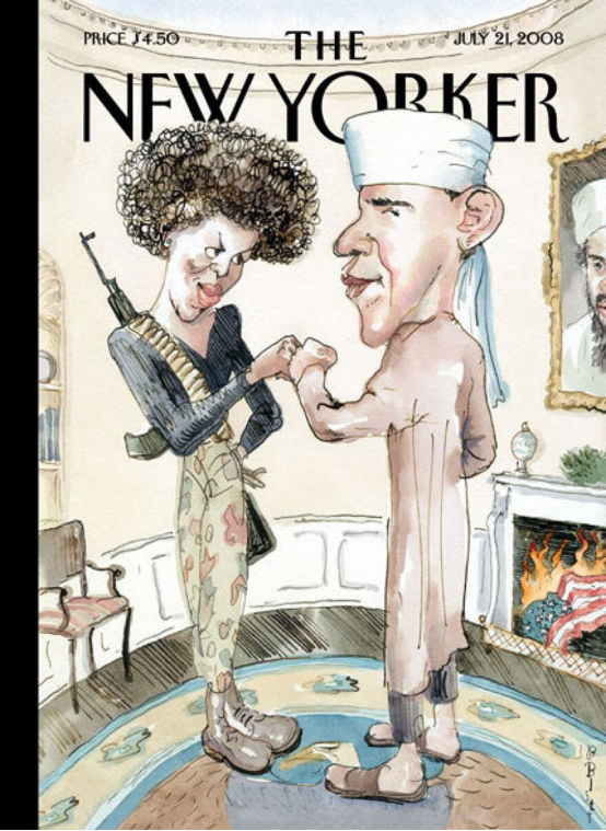 2008年7月21日的《紐約客》封面,標題為“恐懼的政治”,以刻板印象中的恐怖分子/穆斯林形象描繪了巴拉克和米歇爾·奧巴馬。由巴里·布利特 (Barry Blitt)?用水彩和墨水諷刺畫創作。該封面通過諷刺手法呈現右翼關于奧巴馬家族的陰謀論,引發了巨大爭議。