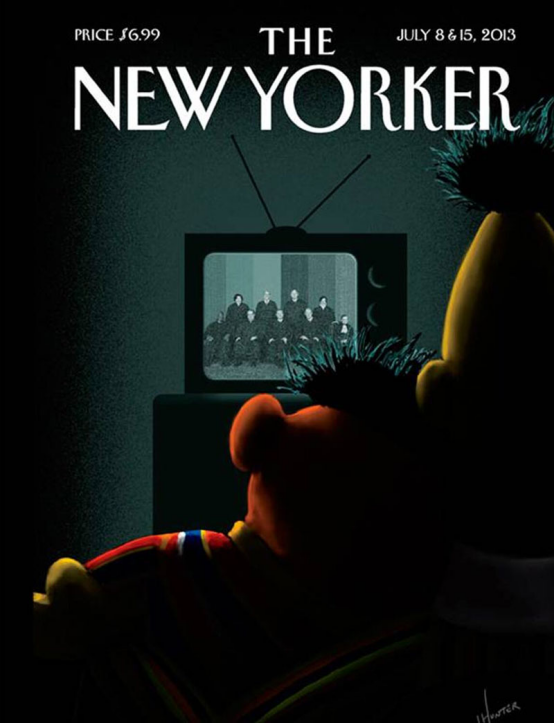 2013年7月1日的《紐約客》封面,描繪了《芝麻街》角色伯特和厄尼在電視上觀看最高法院裁決。由杰克·亨特 (Jack Hunter)?使用數字插畫技術創作。該封面通過深受喜愛的兒童角色慶祝了最高法院關于婚姻平等的裁決。