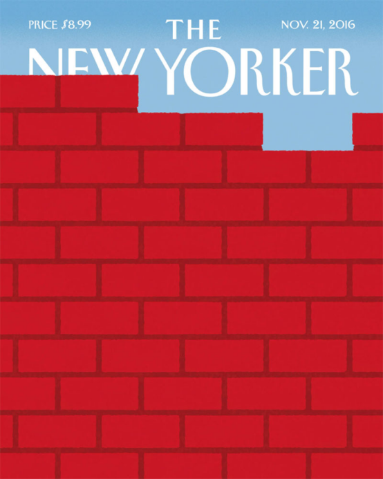2016年11月21日的《紐約客》封面,標題為“墻”,描繪了一堵部分遮擋雜志刊頭的紅磚墻。由鮑勃·斯塔克 (Bob Staake)?運用極簡主義設計原則創作。該封面以鮮明的象征意象回應了特朗普出人意料的選舉勝利。